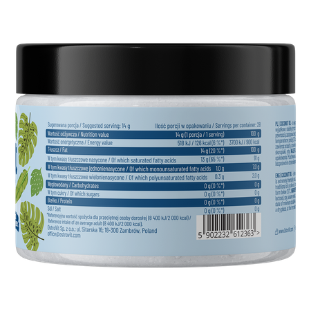 L'huile de coco OstroVit est un produit 100% naturel, raffiné, sans sel ni sucre ajouté et exempt de toute impureté. Il s'agit d'une préparation particulièrement recommandée pour les consommateurs conscients et les personnes physiquement actives.