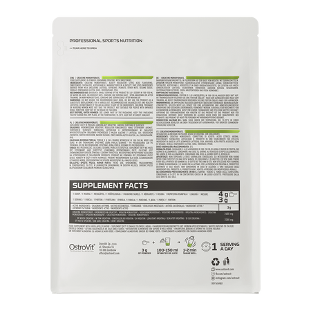 OstroVit utilise de la créatine monohydrate, c'est-à-dire la combinaison d'une molécule de créatine avec une molécule d'eau en une seule molécule - la créatine étant un composé hydrophile, elle se combine facilement avec l'eau et est donc une substance présentant une excellente biodisponibilité. La créatine monohydrate est la forme la plus simple de créatine en termes de structure, et en même temps le composé qui jouit de la plus grande popularité parmi les athlètes - elle est idéale pour les débutants dans un style de vie actif ainsi que pour les professionnels, en raison du fait que la créatine augmente la performance physique dans le cas d'exercices physiques successifs, courts et très intensifs, et les effets bénéfiques se produisent lorsque 3 g de créatine sont consommés quotidiennement.