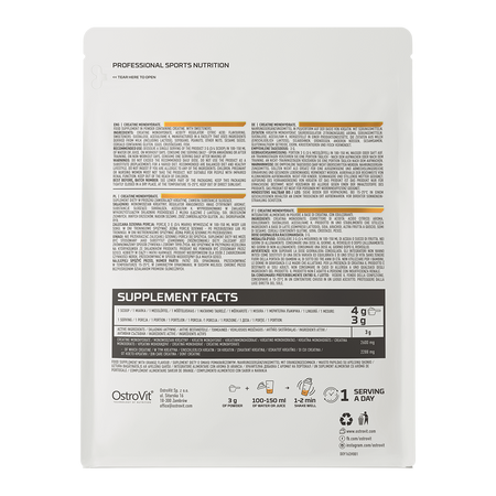 OstroVit utilise de la créatine monohydrate, c'est-à-dire la combinaison d'une molécule de créatine avec une molécule d'eau en une seule molécule - la créatine étant un composé hydrophile, elle se combine facilement avec l'eau et est donc une substance présentant une excellente biodisponibilité. La créatine monohydrate est la forme la plus simple de créatine en termes de structure, et en même temps le composé qui jouit de la plus grande popularité parmi les athlètes - elle est idéale pour les débutants dans un style de vie actif ainsi que pour les professionnels, en raison du fait que la créatine augmente la performance physique dans le cas d'exercices physiques successifs, courts et très intensifs, et les effets bénéfiques se produisent lorsque 3 g de créatine sont consommés quotidiennement.