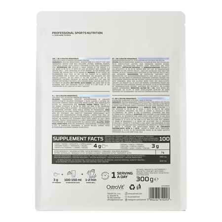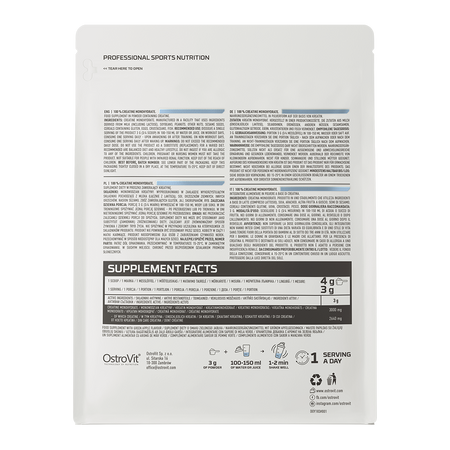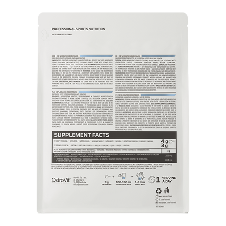 OstroVit utilise de la créatine monohydrate, c'est-à-dire la combinaison d'une molécule de créatine avec une molécule d'eau en une seule molécule - la créatine étant un composé hydrophile, elle se combine facilement avec l'eau et est donc une substance présentant une excellente biodisponibilité. La créatine monohydrate est la forme la plus simple de créatine en termes de structure, et en même temps le composé qui jouit de la plus grande popularité parmi les athlètes - elle est idéale pour les débutants dans un style de vie actif ainsi que pour les professionnels, en raison du fait que la créatine augmente la performance physique dans le cas d'exercices physiques successifs, courts et très intensifs, et les effets bénéfiques se produisent lorsque 3 g de créatine sont consommés quotidiennement.