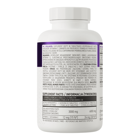 OstroVit Collagène est un complément alimentaire qui constitue une source de collagène bovin hydrolysé de haute qualité et d'acide L-ascorbique précieux. Ce produit est disponible sous forme de comprimés faciles à avaler et est particulièrement recommandé aux sportifs et aux personnes qui souhaitent avoir une apparence saine et belle.