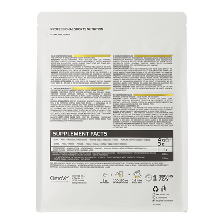 OstroVit utilise de la créatine monohydrate, c'est-à-dire la combinaison d'une molécule de créatine avec une molécule d'eau en une seule molécule - la créatine étant un composé hydrophile, elle se combine facilement avec l'eau et est donc une substance présentant une excellente biodisponibilité. La créatine monohydrate est la forme la plus simple de créatine en termes de structure, et en même temps le composé qui jouit de la plus grande popularité parmi les athlètes - elle est idéale pour les débutants dans un style de vie actif ainsi que pour les professionnels, en raison du fait que la créatine augmente la performance physique dans le cas d'exercices physiques successifs, courts et très intensifs, et les effets bénéfiques se produisent lorsque 3 g de créatine sont consommés quotidiennement.