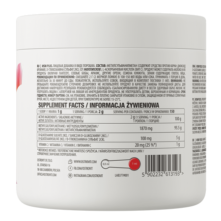 OstroVit MSM Plus est un complément alimentaire qui fournit une source de méthylsulfonylméthane, également connu sous le nom de soufre organique. En outre, la formule a été enrichie d'ingrédients précieux tels que la vitamine C et la glucosamine. Ce produit de haute qualité est disponible sous forme de poudre et a été développé pour les athlètes et les personnes qui souhaitent compléter leur alimentation quotidienne avec des composés précieux.