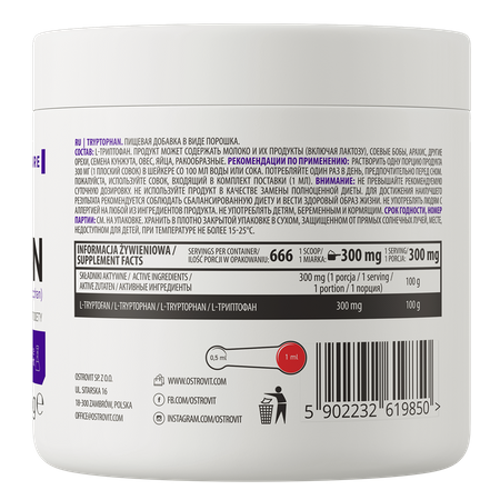 - Source de L-tryptophane - une portion du complément alimentaire apporte à l'organisme 300 mg de l'acide aminé.