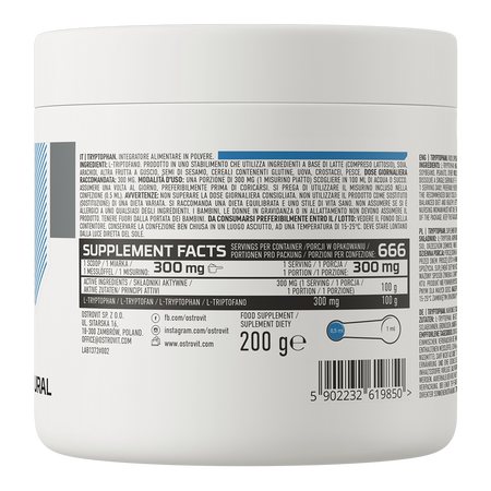 OstroVit Tryptophan est un complément alimentaire de haute qualité qui fournit une source de tryptophane. Il s'agit d'une formule à la composition simple et au goût naturel, disponible sous forme de poudre pratique. Il s'agit d'un produit créé pour les consommateurs conscients qui souhaitent compléter leur alimentation quotidienne avec un acide aminé précieux.