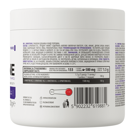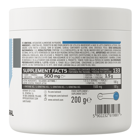 - Source de L-ornithine - une portion du complément alimentaire apporte à l'organisme 1500 mg de L-ornithine HCl.