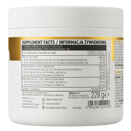 OstroVit Omega 3-6-9 est un complément alimentaire qui constitue une source de précieux acides gras insaturés oméga-3, ainsi que d'oméga-6 et d'oméga-9, et qui apporte en outre de la vitamine E à l'organisme. Il s'agit d'une préparation sous forme de gélules faciles à avaler, qui est recommandée en particulier pour les personnes ayant un besoin accru des composés susmentionnés.