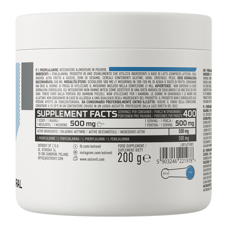OstroVit Phénylalanine est un complément alimentaire de haute qualité qui fournit une source de phénylalanine. Il s'agit d'une formule à la composition simple et au goût naturel, disponible sous forme de poudre pratique. Il s'agit d'un produit créé pour les consommateurs conscients qui souhaitent compléter leur alimentation quotidienne avec un acide aminé précieux.