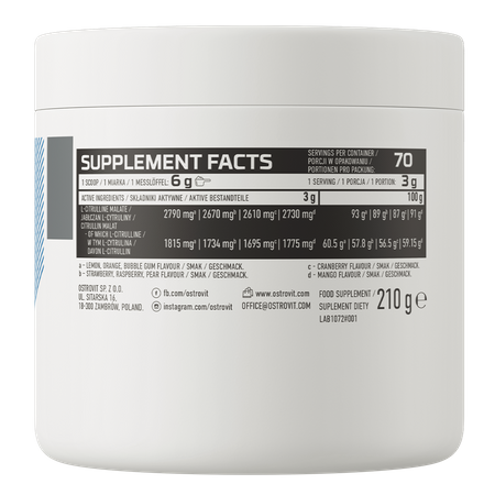 OstroVit utilise le malate de citrulline, une forme du composé qui se distingue par son excellente biodisponibilité et son ergogénicité, ce qui a un effet positif sur la qualité de la préparation et l'efficacité de la supplémentation.