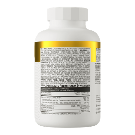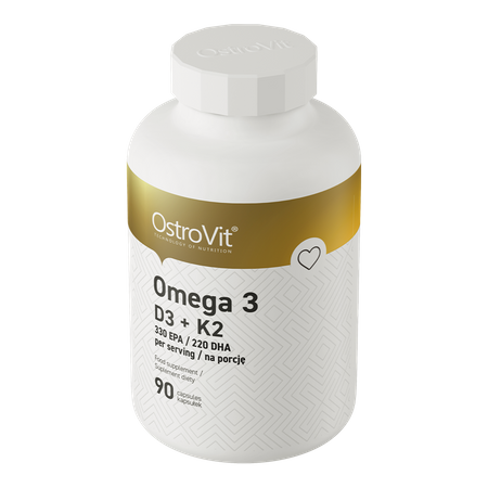 Présents dans le complément alimentaire OstroVit Omega 3 D3 + K2 acide docosahexaénoïque (DHA) contribue au maintien d'une fonction cérébrale normale et au maintien d'une vision correcte. Cependant, il est important de savoir que l'effet bénéfique se produit lorsque 250 mg de DHA sont consommés quotidiennement. En outre acide eicosapentaénoïque (EPA) et acide docosahexaénoïque (DHA) contribuent au bon fonctionnement du cœur ; toutefois, les effets bénéfiques se produisent lorsque 250 mg d'EPA et de DHA sont consommés quotidiennement.