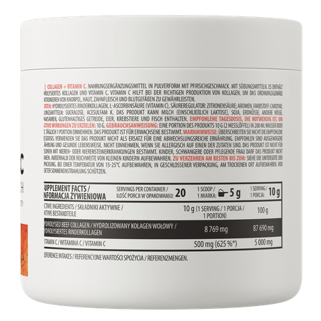 OstroVit Collagen + Vitamin C est un complément alimentaire de haute qualité qui est une source de collagène bovin hydrolysé et de précieux acide L-ascorbique. Il s'agit d'un produit en poudre, disponible dans une variété d'arômes, qui est idéal pour compléter l'alimentation quotidienne des personnes physiquement actives et de celles qui sont soucieuses d'avoir une apparence saine et belle.