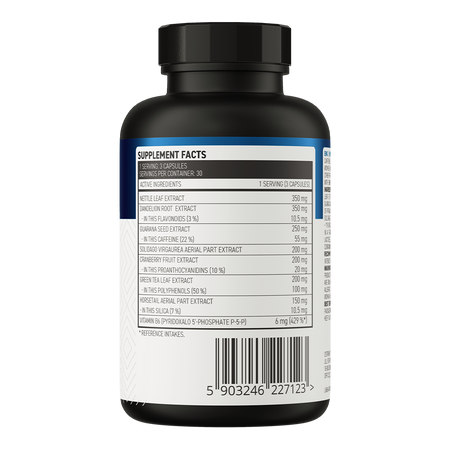 - Source de 8 ingrédients précieux - une portion du complément alimentaire apporte à l'organisme 350 mg d'extrait de feuille d'ortie, 350 mg d'extrait de racine de pissenlit standardisé à 3% de flavonoïdes, 250 mg d'extrait de graine guaranas standardisé à 22% de caféine, 200 mg de parties broyées de verge d'or, 200 mg d'extrait de fruit de canneberge standardisé à 10% de proanthocyanidines, 200 mg d'extrait de feuille de thé vert standardisé à 50% de polyphénols et 150 mg d'extrait de parties broyées de prêle des champs standardisé à 7% de silice et 6 mg de vitamine B6.