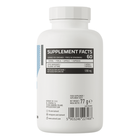 OstroVit MSM 1200 mg est un complément alimentaire qui fournit une source de méthylsulfonylméthane, également connu sous le nom de soufre organique. Il s'agit d'une préparation de haute qualité à la formulation simple, disponible sous forme de gélules faciles à avaler. Il s'agit d'un produit conçu pour les athlètes et les personnes qui souhaitent compléter leur alimentation quotidienne avec un composé de valeur.