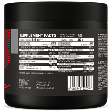 - Source d'ingrédients précieux - une portion du complément alimentaire apporte à l'organisme 3500 mg de malate de L-citrulline, 1600 mg d'A-AKG, 1500 mg de L-arginine, 800 mg de bêta-alanine, 500 mg de taurine, ainsi que 500 mg d'extrait de racine de betterave DER 4:1, 300 mg de L-tyrosine, 200 mg de caféine anhydre et 150 mg d'extrait de pépins de raisin. En outre, la préparation contient 2,1 mg d'extrait de fruit de poivre noir, 80 mg de vitamine C, 58 mg de magnésium et 1,4 mg de vitamine B6.