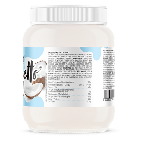 OstroVit Creametto 320 g est une crème naturelle aromatisée à la noix de coco qui existe également en six autres saveurs délicieuses. La crème ne contient ni sucre ni huile de palme supplémentaires, ce qui en fait un en-cas idéal à déguster à tout moment de la journée!