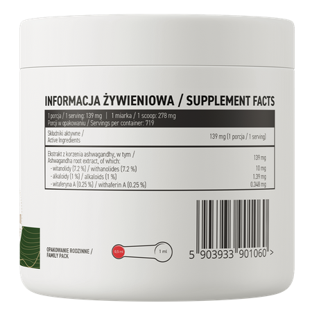 OstroVit Ashwagandha Extract est un complément alimentaire de haute qualité qui contient un extrait de racine d'ashwagandha standardisé à 7,2% de vitanolides, 1% d'alcaloïdes et 0,25% de vitaphérine A. Il s'agit d'une préparation végétalienne, disponible sous forme de poudre pratique. Il s'agit d'un produit créé pour les personnes qui souhaitent compléter leur alimentation quotidienne avec des ingrédients de valeur.