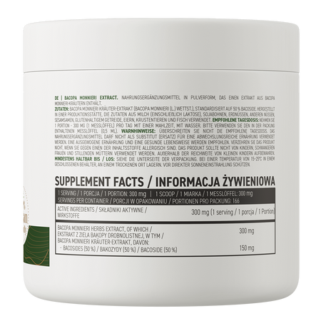 - Une portion du complément alimentaire apporte à l'organisme 300 mg of Bacopa monnieri herb extract standardized to 50% bacosides.