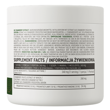 OstroVit Cranberry Extract est un complément alimentaire qui contient de l'extrait de canneberge standardisé à 10% de proanthocyanidines. Ce produit est disponible sous forme de poudre pratique, conçue pour les personnes qui souhaitent compléter leur alimentation quotidienne avec des ingrédients précieux.