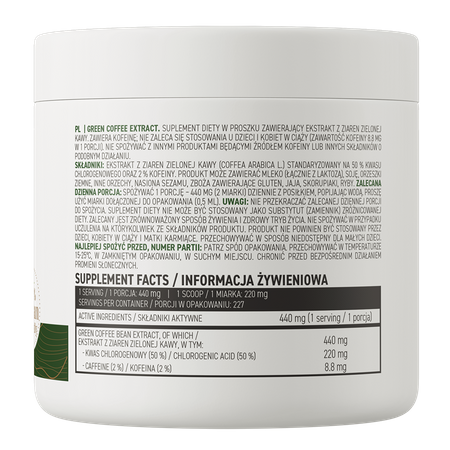 L'extrait de grains de café vert utilisé dans le produit OstroVit est standardisé pour sa teneur en acide chlorogénique et en caféine, ce qui a un effet positif sur la qualité du complément alimentaire et garantit un apport élevé de composés précieux dans chaque portion.