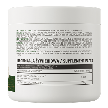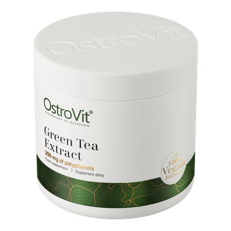 OstroVit Green Tea Extract est un complément alimentaire qui contient de l'extrait de feuilles de thé vert standardisé à 50% de polyphénols. Il s'agit d'une préparation de haute qualité, disponible sous forme de poudre pratique, qui a été développée pour les consommateurs conscients qui souhaitent compléter leur alimentation quotidienne avec des substances précieuses.