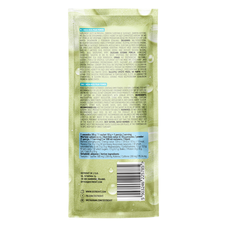 OstroVit Aqua Kick Pear Power est un complément alimentaire de haute qualité qui fournit une source de deux ingrédients précieux - la caféine et la taurine. Il s'agit d'une préparation au délicieux goût de poire, disponible sous forme de sachet. Il s'agit d'un produit conçu pour les athlètes et les personnes qui veulent stimuler leur corps.
