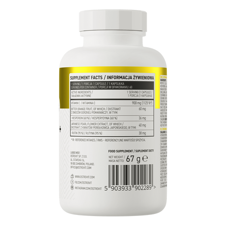 - Source de trois composés précieux - une portion du complément alimentaire apporte à l'organisme 900 mg de vitamine C, ainsi que 60 mg d'extrait de fruit d'orange amère standardisé à 60% d'hespéridine et 40 mg d'extrait de fleur de perle du Japon standardisé à 95% de rutine.