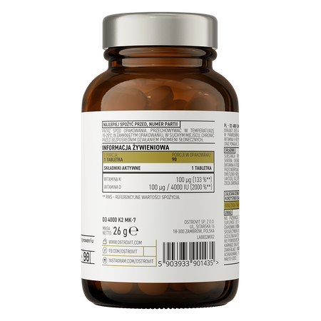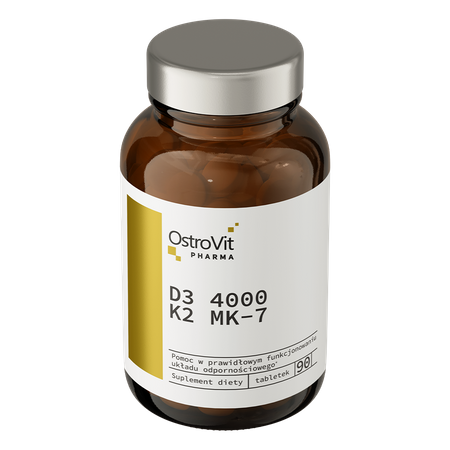 OstroVit Vitamine D3 4000 UI + K2 est un complément alimentaire de haute qualité qui fournit une source de vitamine D3 et de vitamine K2, sous forme de MK-7, qui est mieux absorbée par le corps humain. Préparation sous forme de comprimés faciles à avaler, conçue pour les personnes qui ont besoin de compléter leur alimentation quotidienne avec des micronutriments précieux.