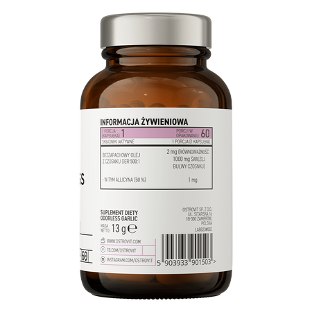 - Source d'huile d'ail inodore - une portion du complément alimentaire apporte à l'organisme 2 mg du composé, soit l'équivalent de 1000 mg de bulbe d'ail frais. En outre, la substance contient 50 % (1 mg) du composé allicine.