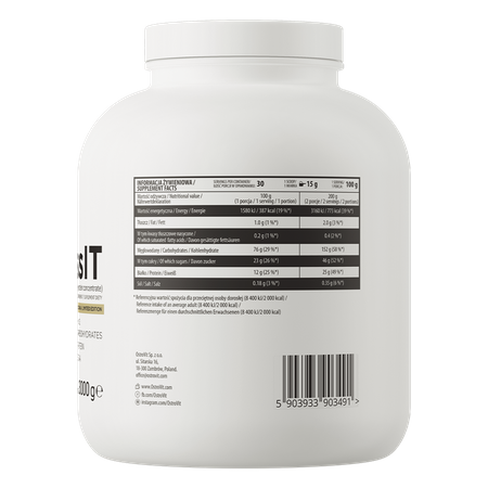 OstroVit Mass IT est un complément alimentaire de haute qualité qui fournit une source d'hydrates de carbone et de protéines. Ce nutriment est disponible sous forme de poudre pratique, avec un délicieux goût de chocolat qui fond dans la bouche. Ce produit est conçu pour les athlètes et les personnes physiquement actives qui souhaitent compléter leur alimentation avec des macronutriments précieux.