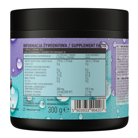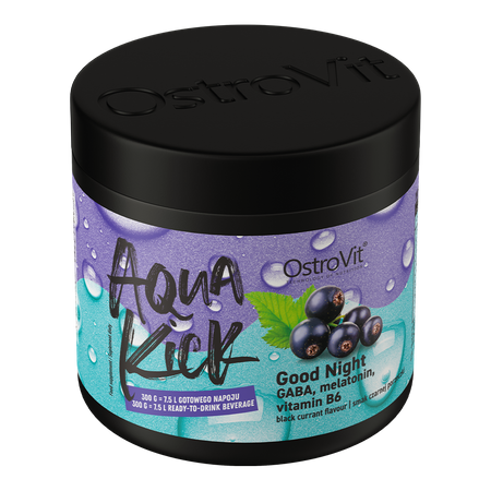 OstroVit Aqua Kick Good Night est un complément alimentaire qui contient un ensemble de trois ingrédients tels que l'acide gamma-aminobutyrique, la vitamine B6 et la mélatonine. Il s'agit d'une préparation au délicieux goût de cassis, disponible sous forme de poudre, qui se dissout parfaitement dans l'eau. Il s'agit d'un produit créé pour les personnes qui se soucient d'une régénération correcte et d'un sommeil de qualité.