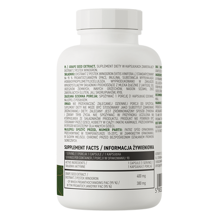OstroVit VEGE Grape Seed Extract est un complément alimentaire de haute qualité qui contient de l'extrait de pépins de raisin standardisé à 95% de proanthocyanidines. Il s'agit d'une préparation végétalienne, disponible sous forme de gélules faciles à avaler, conçue pour les personnes qui souhaitent compléter leur alimentation quotidienne avec des composés précieux.