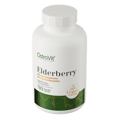 OstroVit Sureau noir VEGE est un complément alimentaire de haute qualité qui contient de l'extrait de sureau standardisé à 40% de polyphénols et 5% d'anthocyanes. Il s'agit d'une préparation végétalienne, disponible sous forme de gélules faciles à avaler. Ce produit est conçu pour les personnes qui souhaitent compléter leur alimentation quotidienne avec des composés précieux.