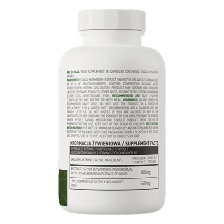 OstroVit Chaga VEGE est un complément alimentaire de haute qualité qui contient un extrait du champignon épineux sous-cortical standardisé à 40% de polysaccharides DER 20:1. Il s'agit d'une préparation végétalienne, disponible sous forme de gélules faciles à avaler, conçue pour les personnes qui souhaitent compléter leur alimentation avec des ingrédients naturels et précieux.