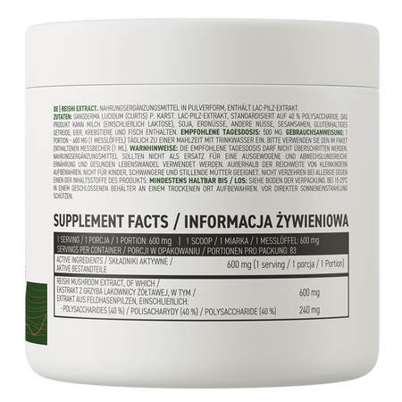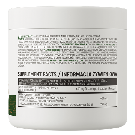 OstroVit Reishi Mushroom Extract est un complément alimentaire qui fournit une source d'extrait de champignon reishi standardisé à 40% de polysaccharides. Il s'agit d'une préparation à la formulation simple, disponible sous forme de poudre. Il s'agit d'un produit créé pour les consommateurs conscients qui souhaitent compléter leur alimentation quotidienne avec des composés précieux d'origine naturelle.