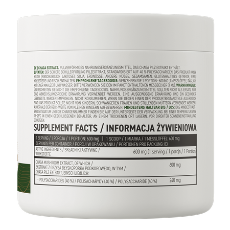 OstroVit Chaga Extract est un complément alimentaire de haute qualité qui contient un extrait du champignon épineux sous-cortical standardisé à 40% de polysaccharides. Il s'agit d'une formule à la composition simple qui ne contient pas d'additifs superflus, disponible sous forme de poudre pratique. Ce produit est recommandé aux personnes qui souhaitent compléter leur alimentation quotidienne avec des composés précieux.