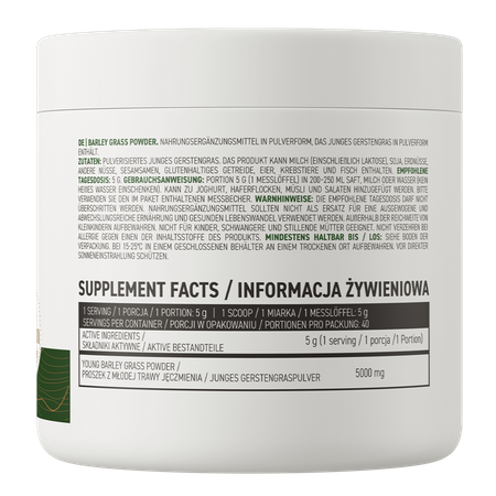 - Contient de la poudre d'herbe d'orge jeune - une portion du complément alimentaire apporte à l'organisme 5000 mg de la substance.