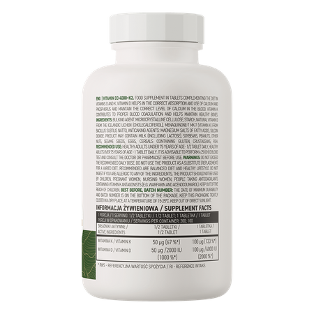 - Source de vitamine D3 et K2 - un comprimé de complément alimentaire contient 4000 UI de cholécalciférol et 100 μg de ménaquinone-7-MK-7.