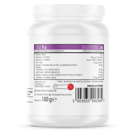 OstroVit Pharma Immune Aid est un complément alimentaire de haute qualité qui fournit une source d'inuline, de vitamine C, de vitamine D, ainsi que de zinc, de sureau et d'extrait de fruit d'acérola. Il s'agit d'une formule disponible sous forme de poudre pratique qui se distingue par son arôme unique de framboise. Ce produit de la gamme d'élite d'OstroVit Pharma a été créé pour les personnes qui souhaitent compléter leur alimentation quotidienne avec des ingrédients de valeur.