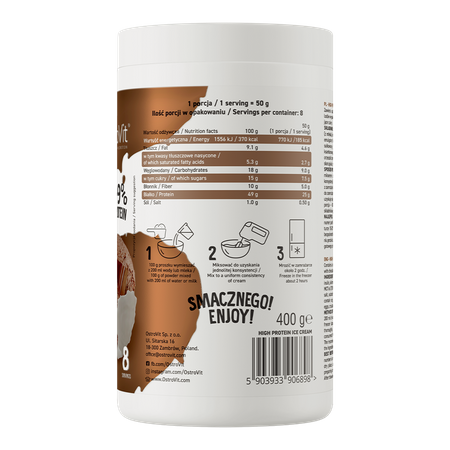 La crème glacée hyperprotéinée OstroVit est un dessert qui constitue une source précieuse de protéines. Il s'agit d'un produit disponible sous forme de poudre, en trois délicieux parfums, qui peut facilement être utilisé pour préparer de délicieuses crèmes glacées. Il s'agit d'un en-cas sans sucre ajouté, qui est idéal comme rafraîchissement riche en protéines pour les consommateurs soucieux des protéines et ayant un besoin accru de protéines, ainsi que pour les athlètes et les personnes actives.