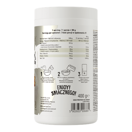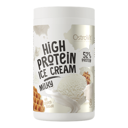 OstroVit High Protein Ice Cream est un produit disponible sous forme de poudre, à partir de laquelle vous pouvez préparer vous-même de délicieuses glaces. Choisissez parmi les saveurs disponibles (ou combinez-les) et créez un dessert rafraîchissant mais rassasiant et riche en protéines! La crème glacée hyperprotéinée OstroVit est un en-cas idéal pour les athlètes et les personnes physiquement actives. Il s'agit également d'un complément idéal au menu pour les personnes ayant un besoin accru en protéines.