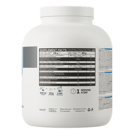 • Enrichi en acides aminés précieux - une partie du produit contient 1200 mg de L-glutamine et 900 mg de L-arginine.