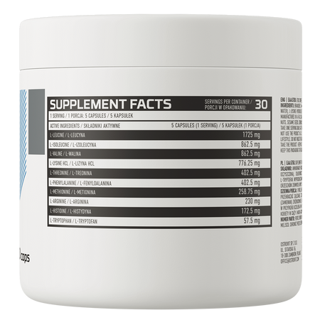 - Source d'acides aminés précieux - une portion du complément alimentaire apporte à l'organisme 1725 mg de L-leucine, 862,5 mg de L-isoleucine, 862,5 mg de L-valine, ainsi que 776,25 mg de L-lysine HCl, 402,5 mg de L-thréonine et 402,5 mg de L-phénylalanine. En outre, une portion contient 258,75 mg de L-méthionine, 230 mg de L-arginine, 172,5 mg de L-histidine et 57,5 mg de L-tryptophane.