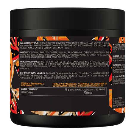 OstroVit Coffee Extreme au goût de caramel salé et de gaufrette est un produit de haute qualité qui offre une expérience gustative unique. C'est une source aromatique de caféine et une explosion de plaisir délicieux.