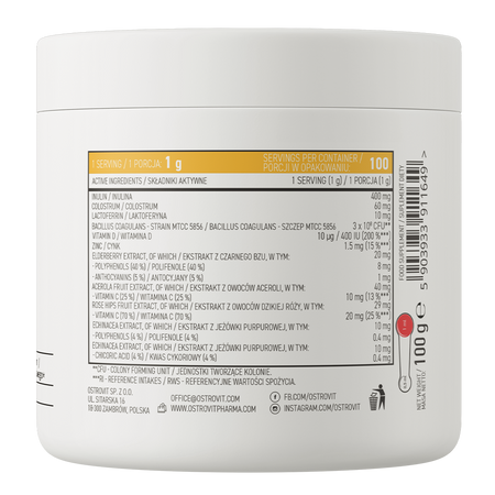 - Riche en extraits de plantes, en prébiotiques et en protéines - complément alimentaire contenant de l'inuline, du colostrum, de la lactoferrine et du bacillus coagulans. En outre, le produit contient de l'extrait de sureau, de l'extrait d'acérola ou de cynorrhodon et de l'extrait d'échinacée.