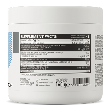 - Ensemble d'ingrédients précieux- une portion du complément alimentaire apporte à l'organisme 2400 mg de complexe de magnésium et 75 mg de complexe de zinc. En outre, la formule contient 300 mg d'acide D-aspartique, 100 mg d'extrait de racine d'ashwagandha standardisé à 5% de vitanolides, ainsi que de la vitamine B6 et de la mélatonine.