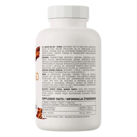 OstroVit Niacin 250 NO-FLUSH est un complément alimentaire de haute qualité qui fournit une source de niacine sous forme d'hexanicotinate d'inositol. Il s'agit d'une préparation disponible sous forme de comprimés faciles à avaler, destinée aux personnes qui se distinguent par un besoin accru en vitamines et minéraux.