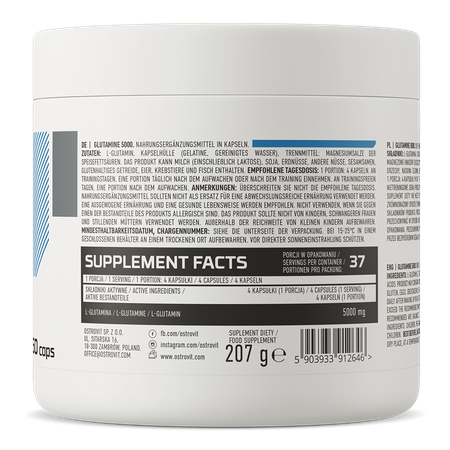 OstroVit Glutamine 5000 mg est un complément alimentaire de haute qualité qui fournit une source d'acide aminé L-glutamine. Il est disponible sous forme de gélules faciles à avaler, conçues pour les athlètes et les personnes qui ont besoin de compléter leur alimentation avec ce précieux composé.