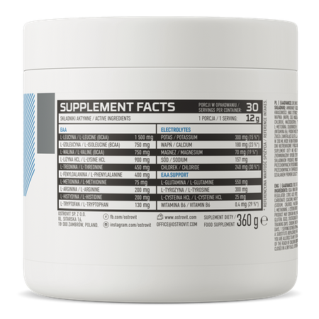 OstroVit EAAdvanced est un complément alimentaire complet qui contient des acides aminés essentiels, ainsi que d'autres acides aminés et électrolytes précieux. Il s'agit d'une formule sans sucre ajouté, disponible en plusieurs saveurs, sous forme de poudre pratique. Il s'agit d'un produit conçu pour les personnes physiquement actives, ainsi que pour celles qui ont besoin de compléter leur alimentation quotidienne avec des composés précieux.