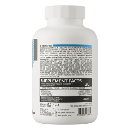 OstroVit Collagen 2550 mg est un complément alimentaire de haute qualité qui contient de l'hydrolysat de collagène bovin. Il se présente sous la forme de gélules faciles à avaler et est particulièrement recommandé aux athlètes et aux personnes qui veulent avoir une apparence saine et belle.
