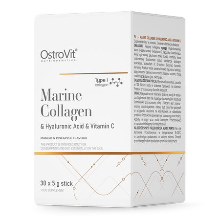 OstroVit Marine Collagen + Hyaluronic Acid + Vitamin C est un complément alimentaire en poudre de haute qualité, conditionné en sachets individuels pratiques à utiliser. Il s'agit d'une préparation qui contient du collagène marin de type I, qui se distingue par son excellente absorption dans le corps humain, ainsi que des ingrédients précieux tels que l'acide hyaluronique, la vitamine C, le zinc ou la biotine. Il s'agit d'un produit créé pour les personnes soucieuses d'avoir une apparence belle et saine, ainsi que pour les athlètes.